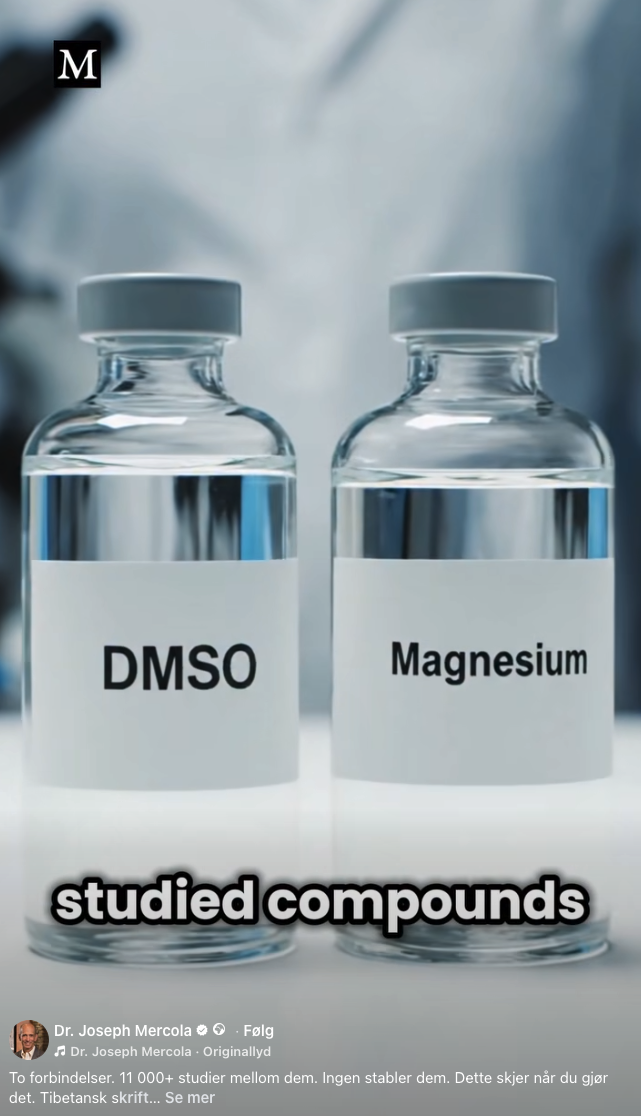 47 Essentials DMSO Spray Magnesium 100ml Artikkelnr.: 096 100 ml spray med magnesium, sprayes på slitne muskler, ømme områder. PrisNOK480,00 inkl. mva. Antall Kjøp Del dette Produktinfo Media og Lenker DMSO Magnesium i Sosiale medier Doseringsanbefaling: Kun til utvortes bruk. Ingredienser: 50 % dimetylsulfoksid (DMSO minst 99,9 % PH.Eur. farmasøytisk kvalitet), 40 % magnesiumolje, (33 g magnesiumklorid)