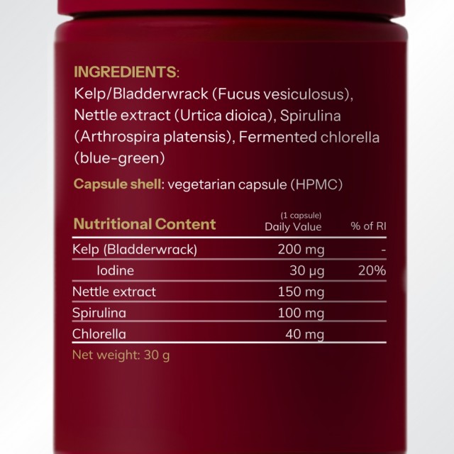 Tare (Fucus vesiculosus), brennesleekstrakt (Urtica dioica), spirulina (Arthrospira platensis), fermentert chlorella (blågrønne mikroalger).
