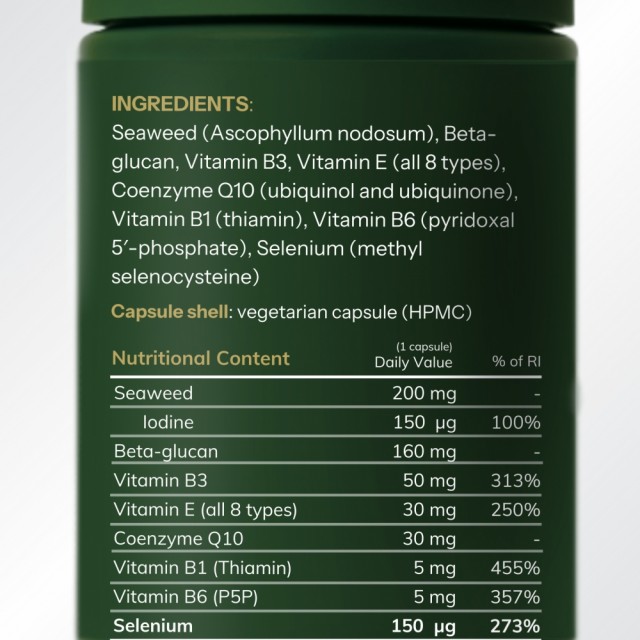 Tang (Ascophyllum nodosum), betaglukan, vitamin B3, vitamin E (alle 8 typer), koenzym Q10 (ubikinol og ubikinon), vitamin B1 (tiamin), vitamin B6 (pyridoksin), selen (metylselenocystein, MSC)