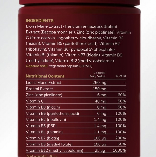 Den kombinerer løvemanke og brahmi (bacopa), essensielle B-vitaminer, mineraler og antioksidanter som gir næring til hjernen og støtter balansen mellom nevrotransmittere. Denne formelen er utviklet med Medis-teknologi og er designet for å bevare næringsstoffkvaliteten og støtte biotilgjengeligheten.
