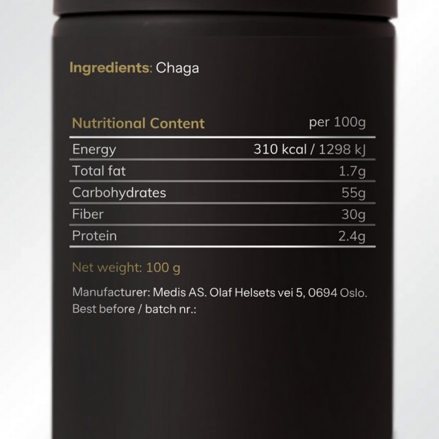 Den er utviklet som et naturlig tilskudd til en balansert livsstil, og tilbyr dyp cellulær næring, immunstøtte og antioksidantbeskyttelse. Denne formelen er utviklet med Medis-teknologi og bevarer soppens naturlige næringsprofil, noe som sikrer optimal renhet, potens og biotilgjengelighet – noe som gjør absorpsjon og effekt høyere enn i konvensjonelle Chaga-produkter.