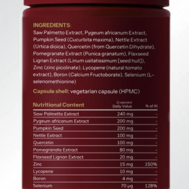Sagpalmeekstrakt, Pygeum africanum-ekstrakt, gresskarkjerner (Cucurbita maxima), brennesleekstrakt (Urtica dioica), quercetin (fra quercetin-dihydrat), granatepleekstrakt (Punica granatum), linfrølignanekstrakt (Linum usitatissimum [frøskall]), sink (sinkpikolinat), lykopen (naturlig tomatekstrakt), bor (fra sitrat, aspartat, glysinat), selen (metylselenocystein)