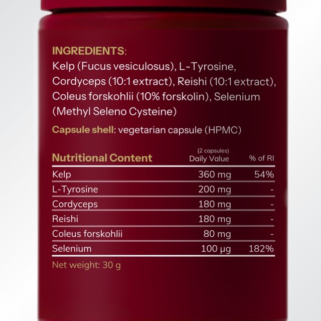 Den kombinerer viktige næringsstoffer, adaptogener og medisinske sopper for å gi næring til skjoldbruskkjertelen og hjelpe kroppen med å tilpasse seg stress. Denne formelen er utviklet med Medis-teknologi og er laget for å bevare næringsstoffkvaliteten og støtte biotilgjengeligheten.